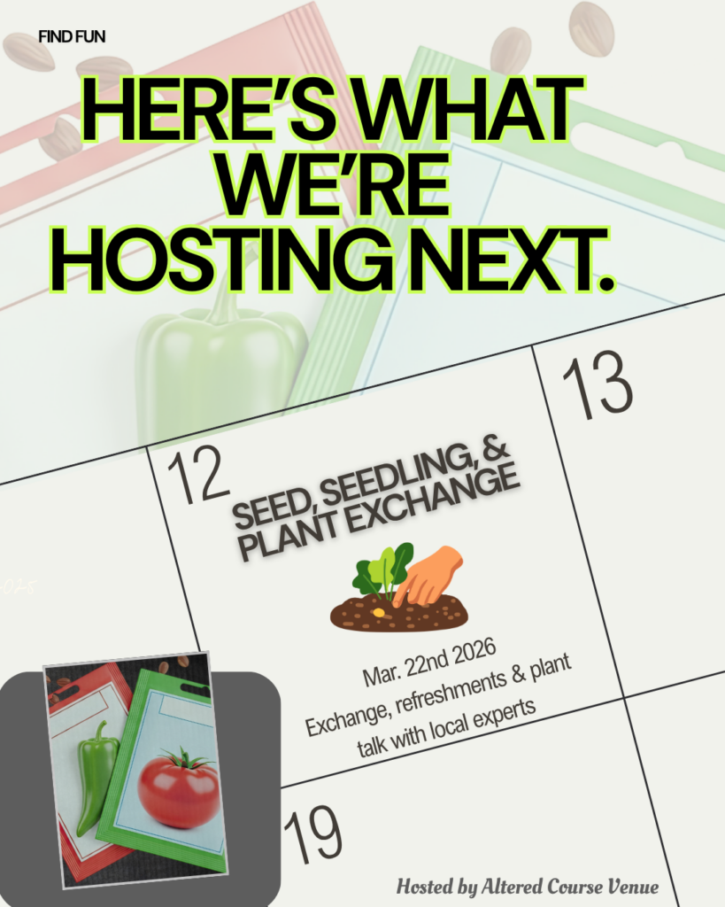 Bring up to ten varieties of seeds, packed individually with up to ten seeds per pack, ten live seedlings, house plant cutting (spider plants, succulents, ivy) and any outside plants that can be separated in early spring.